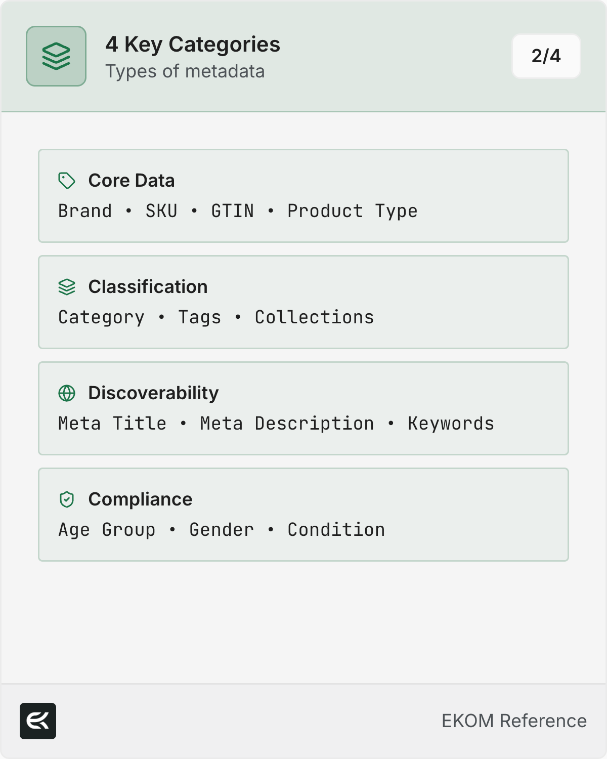 Metadata is organized into layers that enrich your core product data. Classification fields (Category, Brand, Color) enable filtering and organization. Discoverability fields (Tags, Description) improve search. Compliance fields (SKU, Stock Status) ensure platform requirements are met.